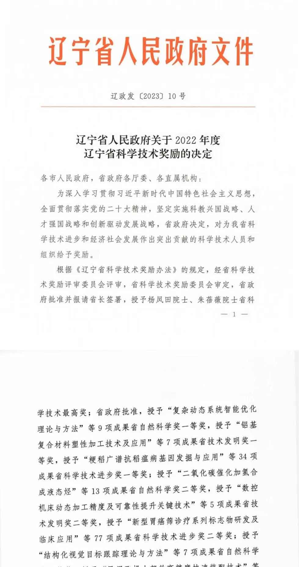 重磅!2022年度辽宁省科学技术奖授奖决定发布