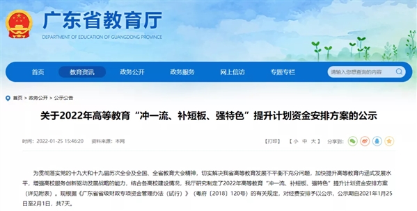 近日,广东省教育厅接连公示两项资金安排方案,拟安排共计近62亿元支持大学改革发展。分别是2022年高等教育“冲一流、补短板、强特色”提升计划资金安排方案,拟安排29.5亿元;省属公办高校提高高等教育毛入学率学位建设综合补助资金及其他基建项目资金安排方案,拟安排32.2652亿元。