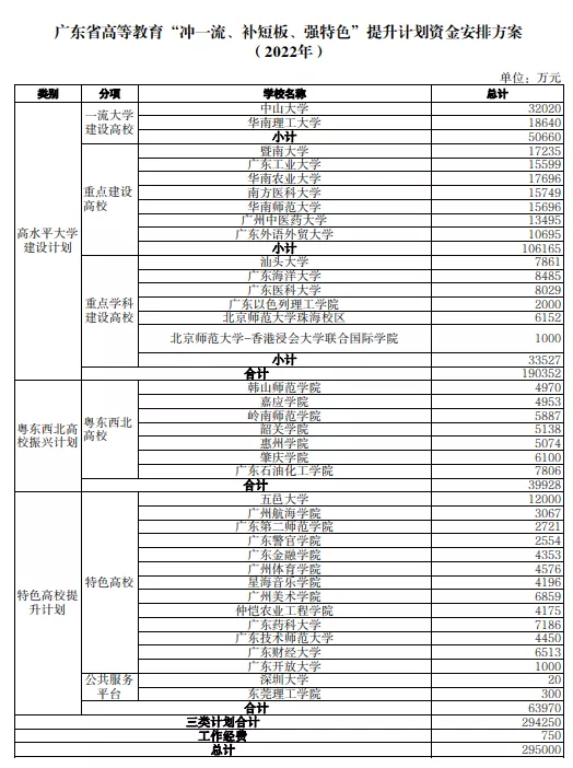 2022年高等教育“冲一流、补短板、强特色”提升计划资金安排分高水平建设计划、粤东西北高校振兴计划、特色高校提升计划三大类别,37所大学获得29.5亿元支持。
