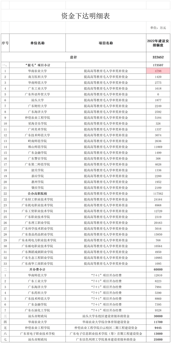 此外,汕头大学获得东校区建设省级补助资金3亿元,华南农业大学获得综合体育馆建设资金1.17亿元,仲恺农业工程学院获得白云校区二期工程建设资金0.9445亿元,广东电子信息职业技术学院(筹)获得首期工程建设资金1.3亿元,广东以色列理工学院获得基本建设省级补助资金2.5亿元。
