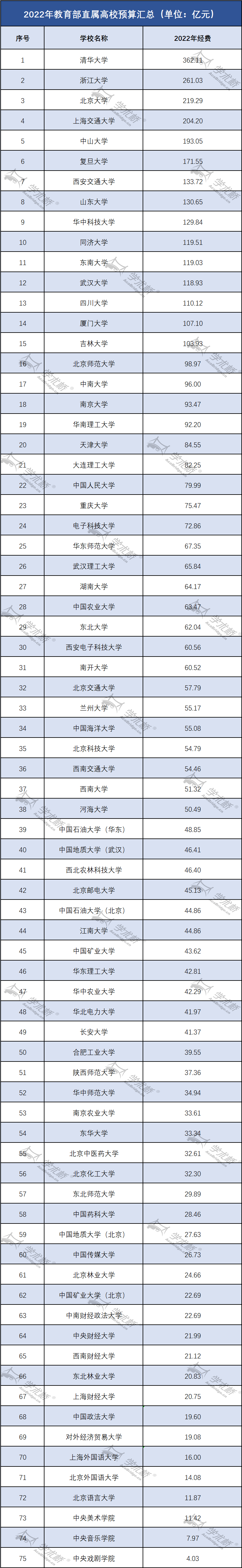 近日,教育部直属的75所高校和工信部直属的7所高校相继公布了2022年的年度预算经费,引起了不少人的关注。在82所高校中,预算超百亿的学校有19所。清华大学最多,约362.11亿元,其次是浙江大学261.03亿元、北京大学219.29亿元和上海交通大学204.20亿元。上海交通大学为首次突破200亿。