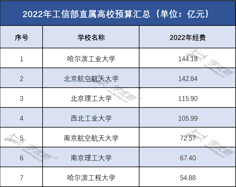 7所工信部直属高校中,哈尔滨工业大学经费预算最高,从去年的108.03亿元增加到今年的144.18亿元,同比增长33.46%;北京航空航天大学位居第二,约142.84亿元;经费预算超过百亿元的还有北京理工大学和西北工业大学,分别为115.9亿元和105.99亿元。南京航空航天大学、南京理工大学和哈尔滨工程大学经费预算均超过50亿元。 这里要说明一下的是,年度涨幅最大的是哈尔滨工程大学经费预算去年约34.73亿,今年约54.88亿,增加了20.15亿元,涨幅为58.02%。