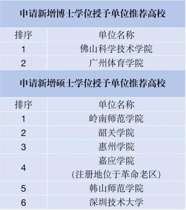 本轮入选广东申请新增博士学位授予单位推荐高校的是佛山科学技术学院、广州体育学院。入选广东申请新增硕士学位授予单位推荐高校的有岭南师范学院、韶关学院、惠州学院、嘉应学院、韩山师范学院、深圳技术大学等6所高校。