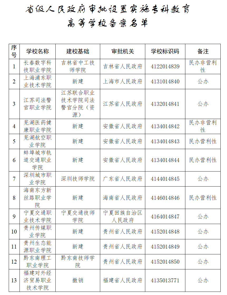 近日,教育部官网发布《关于公布2024年度第一批实施专科教育高等学校备案名单的函》,公布了省级人民政府审批设置的实施专科教育高等学校备案名单。具体名单如下: