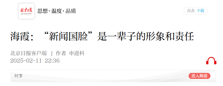 2月11日,北京日报客户端刊发了由人民空军首任新闻发言人申进科撰写的《海霞:“新闻国脸”是一辈子的形象和责任》一文。文章提到,经中央广播电视总台和河南省委组织部批准,海霞被聘任为河南大学学术副校长,为家乡学子深造播音主持专业提供支持。她还被聘任为中国传媒大学博士生导师,为母校学子深造播音主持专业提供支持。