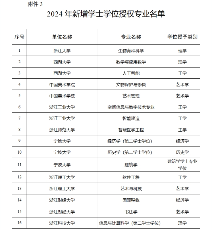 浙江省学位委员会办公室关于2024年新增学士学位授予单位及学士学位授权专业评审结果的公示