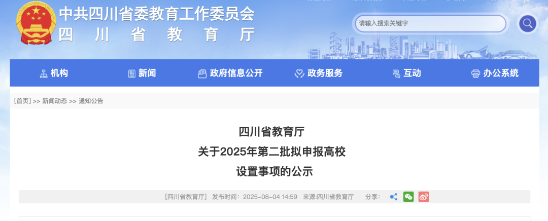 8月4日,四川省教育厅发布关于2025年第二批拟申报高校设置事项的公示。