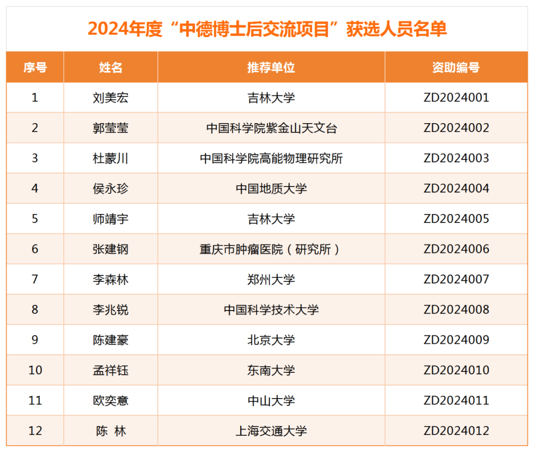 为进一步加强博士后国际交流,提升博士后培养质量,自2014年起,全国博士后管委会办公室与德国亥姆霍兹联合会下属的研究所合作开展了“中德博士后交流项目”,每年选派新近获得博士学位的优秀年轻科研人员赴德开展博士后研究工作。2024年2月,全国博士后管委会办公室印发《关于开展2024年博士后国(境)外交流项目申报工作的通知》(博管办〔2024〕34号),组织开展了2024年“中德博士后交流项目”申报工作。经过个人申报、单位推荐、材料审核和德方专家评选等程序,确定了12名获选人员(名单见附件)。