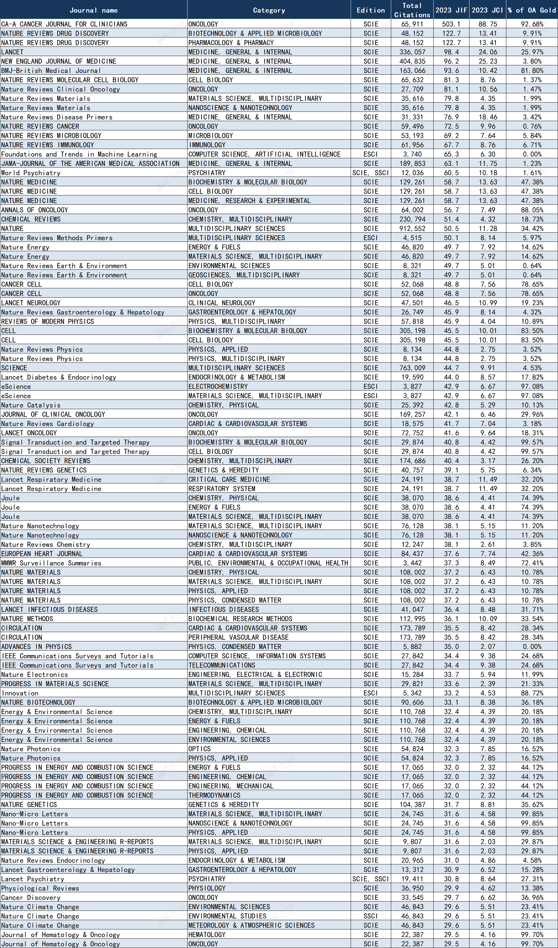 影响因子最高的仍然是Ca-A Cancer Journal for Clinicians,去年为254.7,今年达到503.1。
