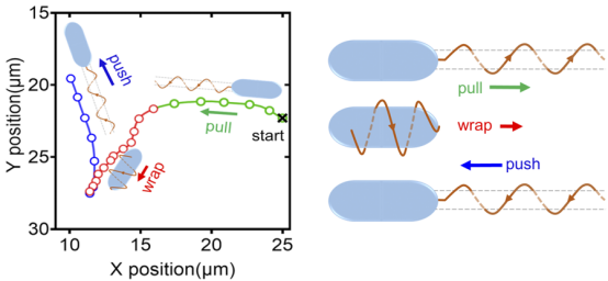 图2. 铜绿假单胞菌游动新模式。(左)图1细菌的游动轨迹示意图,不同颜色代表不同游动模式。(右)三种游动模式下鞭毛丝的状态。