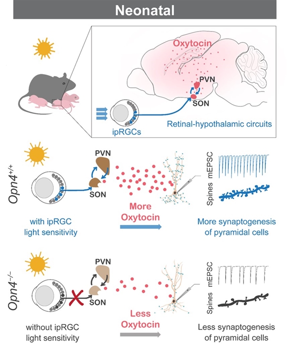 婴幼儿在成长发育早期接受的感觉刺激(包括视觉、听觉,触觉等)对促进其大脑高级认知功能的发育至关重要。作为人类最重要的感知觉输入,发育早期视觉(光)感知能促进多脑区的协同发育和高级脑功能的形成。先前的研究显示,出生后即完全避光暗饲养会导致幼鼠多个感知觉皮层突触形成的减缓,其中神经肽催产素(oxytocin)可能是介导该过程的关键分子。然而,在发育早期视觉(光)是如何被感知、并通过何种神经环路和分子机制促进了多脑区协同发育、以及幼年的视觉(光)剥夺对成年高级脑功能的影响尚不清晰。