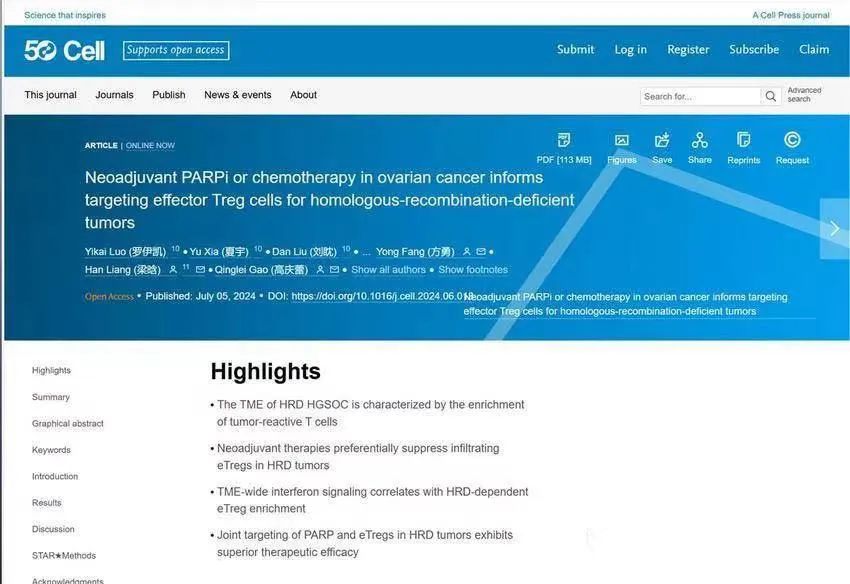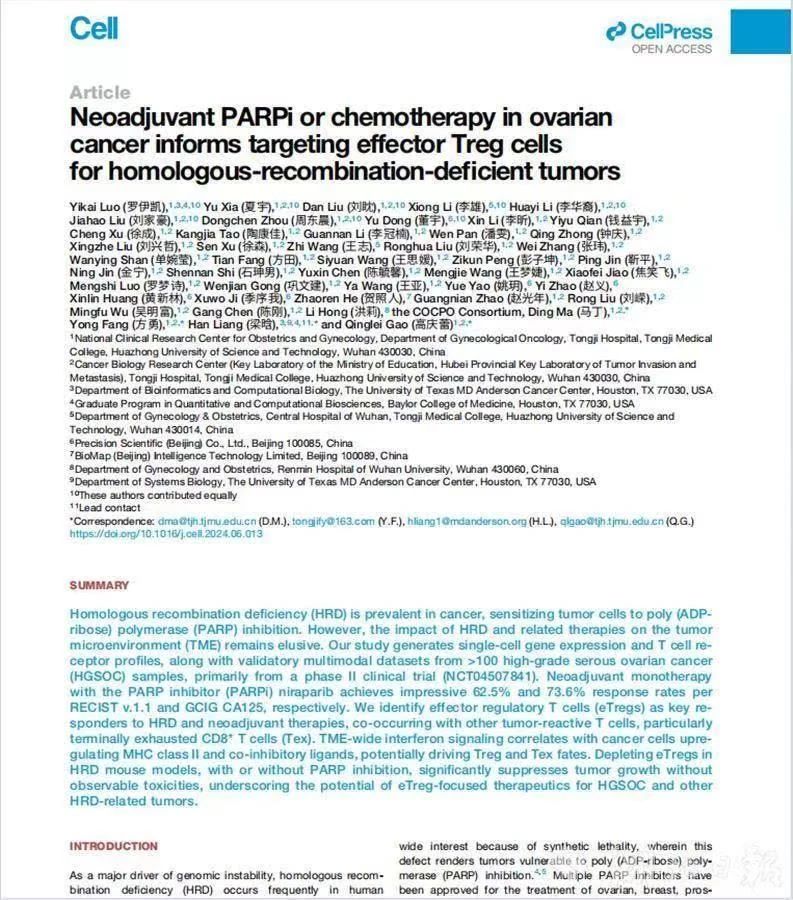 该成果为同济医院马丁院士、高庆蕾教授、方勇教授联合美国梁晗教授团队关于卵巢癌治疗的研究论文“卵巢癌新辅助PARP抑制剂或化疗揭示同源重组缺陷型肿瘤治疗新靶点——eTreg细胞”。这是中国妇科肿瘤专家的研究成果首次荣登《细胞》。