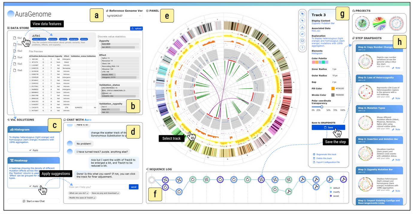 在急性髓系白血病染色体易位分析中,科研人员20分钟内即可完成结构变异与转录水平的可视化生成,发现并交互式标记了潜在生物标志物区域;在黑色素瘤突变图谱复现中,研究人员仅用7分钟便高保真再现了论文中的经典可交互的可视化结果。更多对比实验表明,相比于传统工具Circos,AuraGenome效率提升69%,准确率提升至89%,实现了“让科学家专注基因组数据而非工具本身”的转变。