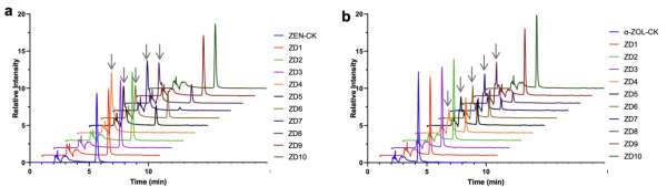 针对真菌毒素玉米赤霉烯酮(ZEN),研究以CACLENS的多任务联合预测结果为基础,在大规模序列空间中筛选出10个潜在降解酶候选体。研究通过基因合成、异源表达与纯化获得相应酶蛋白,并对其降解性能开展实验验证。结果表明,约一半的候选酶具有对ZEN的催化活性,其中ZD4与ZD7能够在体外体系中降解超过90%的ZEN。