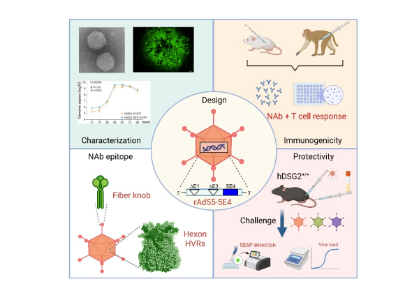 团队利用基因工程技术,删除了病毒复制所需的E1基因和E3基因,并改造了E4基因,获得复制缺陷型HAdV-55候选疫苗。该疫苗株不能在人及动物细胞中复制,仅可在HEK393细胞中复制及生产,产量高且保证了疫苗的安全性。在小鼠及猕猴,接种该疫苗可诱导抗HAdV-55、11和14的长效且高水平的中和抗体,以及细胞免疫应答。团队利用此前建立的hDSG2受体人源化小鼠感染模型,证实该疫苗可有效保护小鼠免受HAdV-55、11和14的攻毒感染。