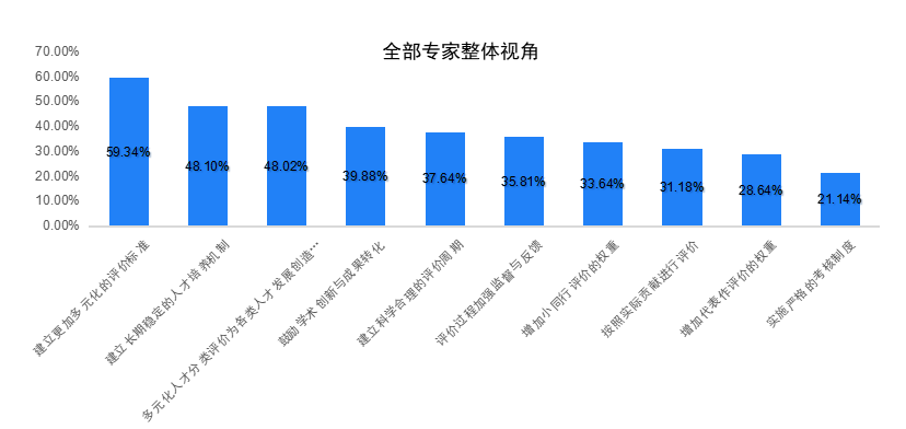 《报告》认为,高校应建立更加多元化的人才评价标准以及长期稳定的人才培养机制。对当前学术人才评价体制机制存在的问题,外审专家关注度最高的是“只注重科研,轻视教学和社会服务(52.65%)”,其次是“评价标准单一(44.77%)”和“过度强调论文数量和影响因子(44.54%)”。总体来看,在高校学术人才评价的改进建议中,外审专家们更建议“建立更加多元化的评价标准”“建立长期稳定的人才培养机制”与“多元化人才分类评价为各类人才发展创造条件”。此外,还应建立长期稳定的人才培养机制,鼓励学术创新与成果转化,并加强评价过程的监督与反馈。