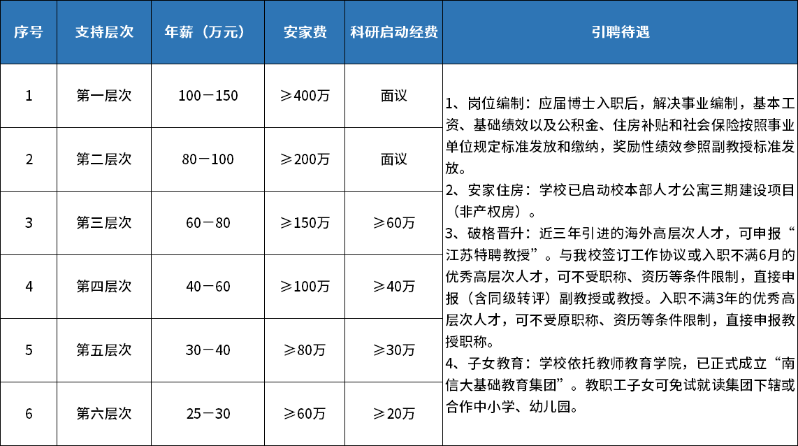 录用人员全部给予高校事业编制,学校将提供国内一流的薪资待遇、完善的科研条件和强大的团队支持。优秀人才可申请南京信息工程大学“龙山学者支持计划”、“青年人才托举计划”、“名师培育工程”等人才项目。