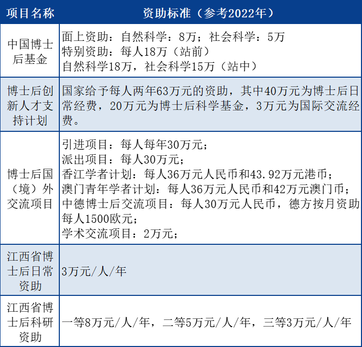 在站期间,博士后可依托我校或联合培养流动站所在单位申请以下国家等级和省级博士后项目,具体项目名称和获批后资助金额(参考2022年)见下表: