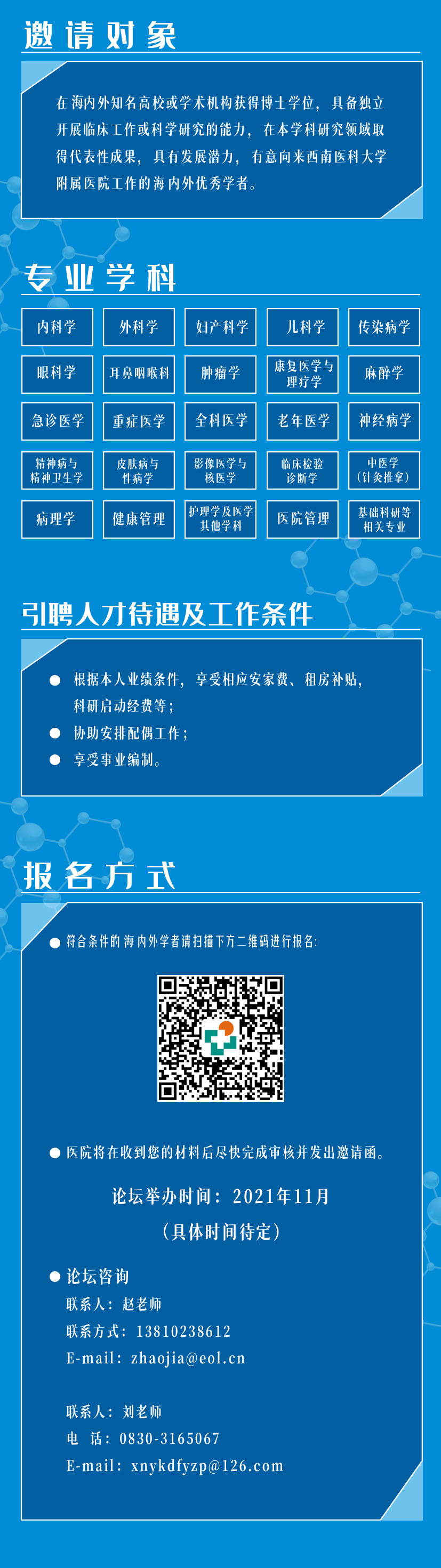 西南医科大学附属医院“酒城 · 忠山”博士(博士后)论坛,是西南医科大学附属医院发起,面向全球学者的人才交流盛会。本次论坛旨在为海内外优秀学者搭建学术交流和学术成果展示平台,就学术前沿与热点问题开展学术研讨,通过研讨和人才洽...