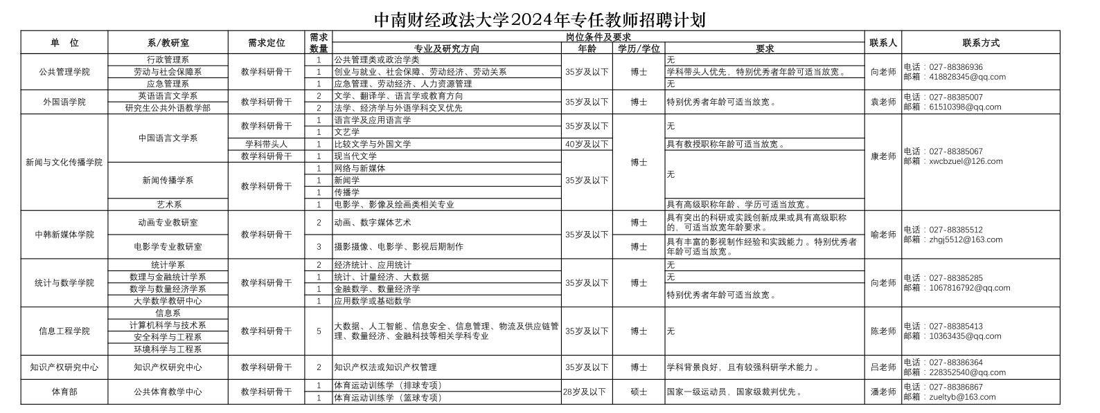 (一)教师岗位:郑老师,电话:027-88386907;邮箱:szb@zuel.edu.cn