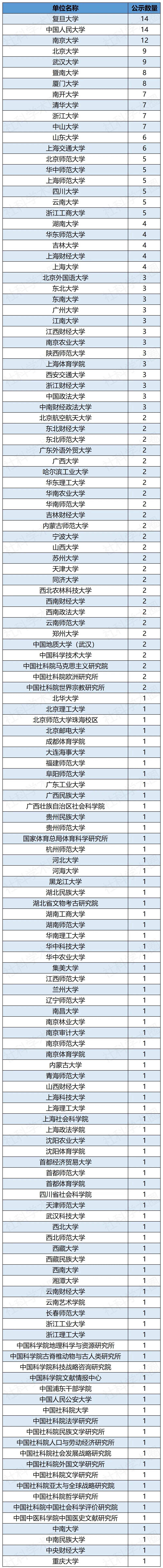 名单显示,本年度共有336个项目进入公示,来自144个高校和科研院所。其中,有三所高校立项数量超过10个,分别为复旦大学(14项)、中国人民大学(14项)、南京大学(12项)。各单位立项数量如下表: