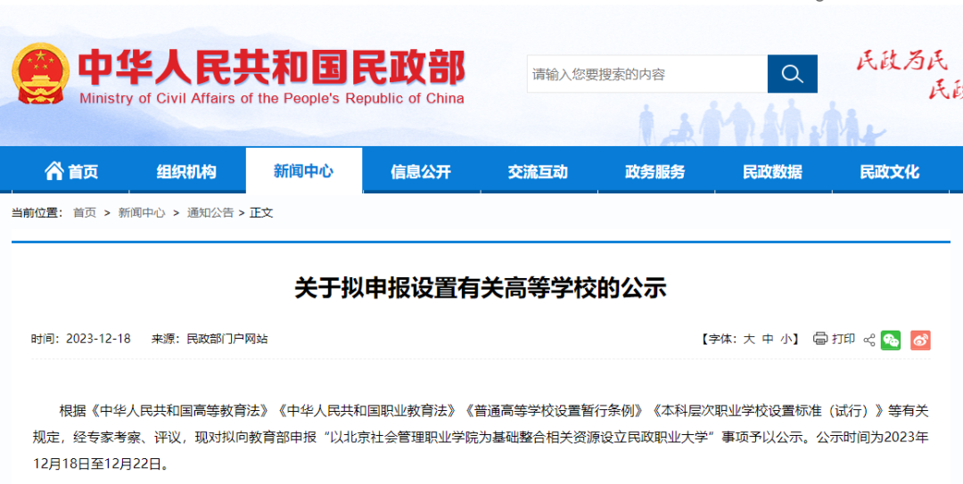 12月18日,民政部门户网站发布消息,对拟向教育部申报“以北京社会管理职业学院为基础整合相关资源设立民政职业大学”事项予以公示。