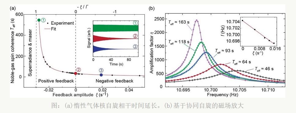 量子系统的相干性对于量子技术的发展至关重要。对于量子精密测量技术而言,更长的相干时间通常意味着更高的测量性能,例如更高的磁力计灵敏度和原子钟精度。然而,局部噪声和磁场不均匀性等不利因素会破坏量子系统的相干性,限制其相干时间。因此,如何增强量子系统的相干时间一直是一个具有挑战性的科学问题。针对这一难题,彭新华教授、江敏副教授团队创新性地提出了基于协同自旋的量子相干增强技术。与独立自旋不同,协同自旋之间存在一定的关联性,能够相互感知。该方案通过碱金属原子测量惰性气体的核自旋,再将信号转化为磁场,实时反馈到核自旋上。在这种情况下,单个核自旋可以根据集体的状态校正自身的相位误差,最终达到增强自旋相干时间的效果。该技术将核自旋的相干时间从约30秒延长到约540秒[见图(a)]。利用相干时间延长的协同核自旋,该工作构建了一种新型的磁场量子放大器,成功实现三个数量级的磁场放大[见图(b)]。进一步,该工作将协同量子放大技术应用于极弱磁场测量,磁场灵敏度达到4fT/Hz1/2,超越了所使用碱金属磁力计本身的自旋投影噪声极限。