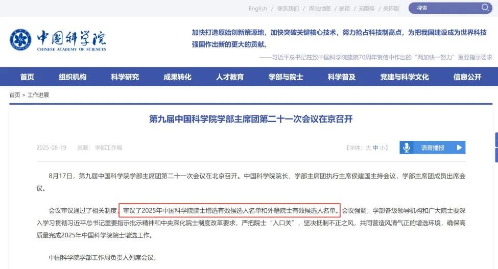 会议审议通过了相关制度,审议了2025年中国科学院院士增选有效候选人名单和外籍院士有效候选人名单。会议强调,学部各级领导机构和广大院士要深入学习贯彻习近平总书记重要指示批示精神和中央深化院士制度改革要求,严把院士“入口关”,坚决抵制不正之风,共同营造风清气正的增选环境,确保高质量完成2025年中国科学院院士增选工作。